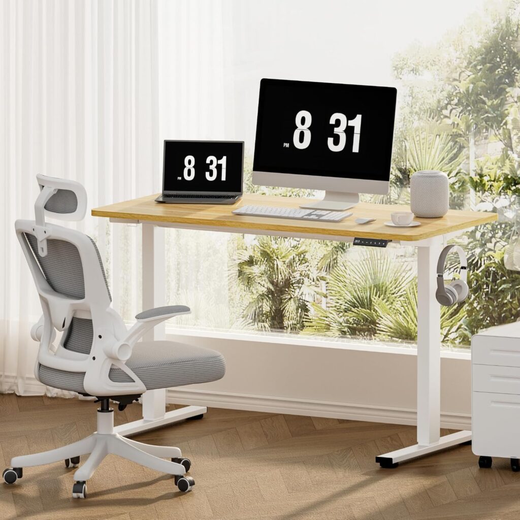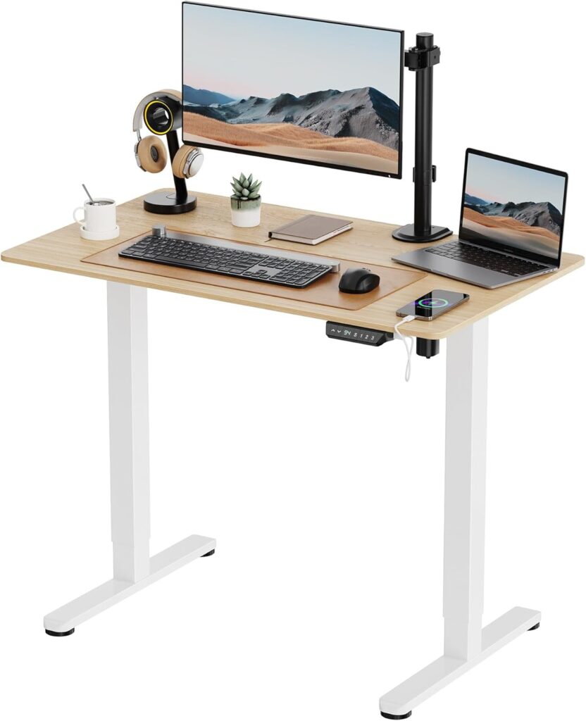 ONE PIECE Electric Standing Desk Height Adjustable Sit Stand Desk with Memory Smart Panel(120 * 60cm, White Frame + Maple Desktop